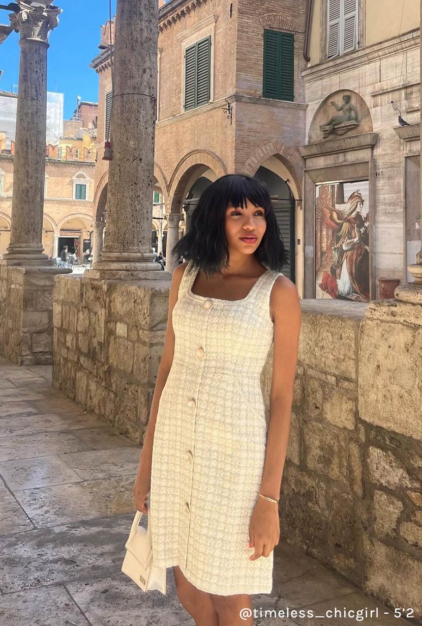 Description:Made from bouclé-tweed stitched with intricate gold threads. It features a square neckline, wide shoulder straps, functional side pockets, and outlined with white ribbon trimmings. Fully lined.